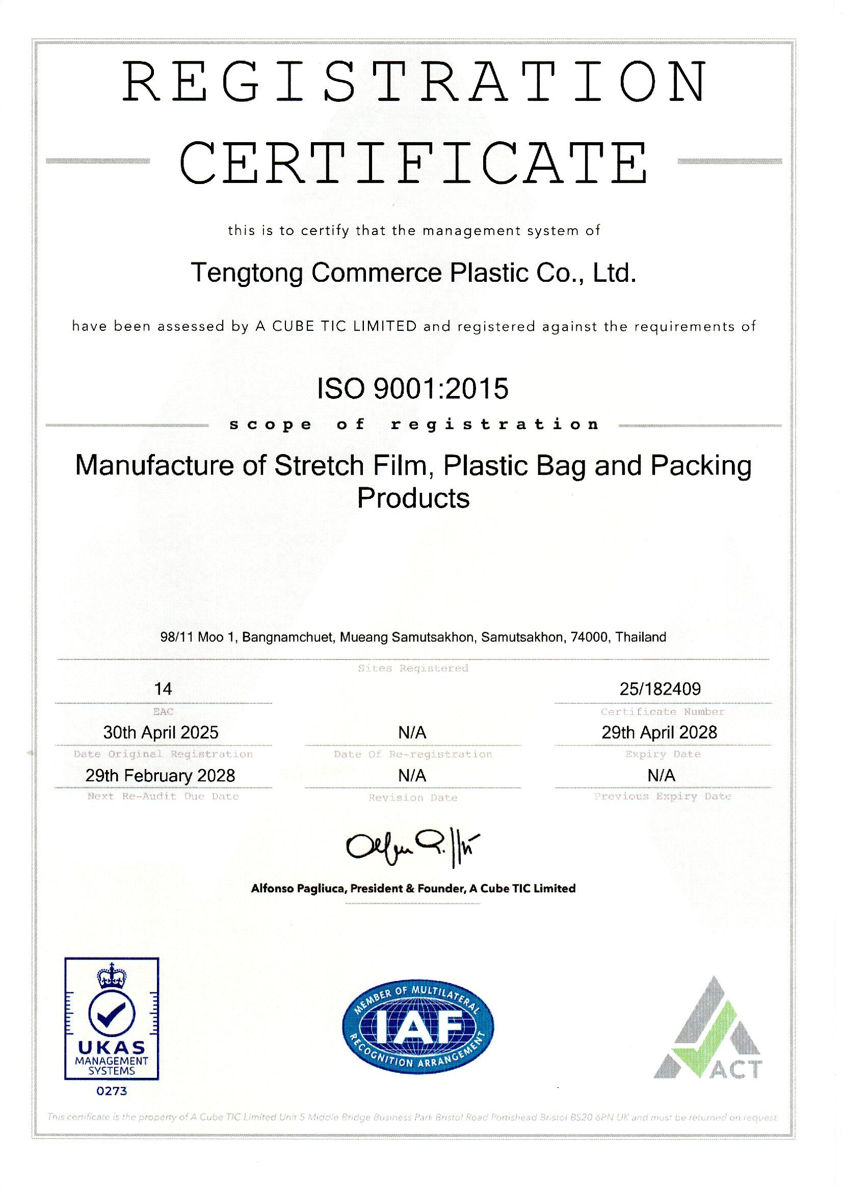 บริษัท เถิงธงพาณิชย์ พลาสติก จํากัด ได้รับมาตรฐาน ISO9001 : 2015 สำหรับ Manufacture of Stretch Film, Plastic Bag and Packing Products